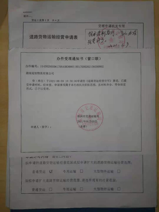 10时38分,株洲市交通运输局驻市民中心窗口正式受理恒驰物流关于道路(普货)运输经营许可的申请,蒋先生在现场签订承诺书并签收告知书,11时35分,交通窗口签发许可决定并向蒋先生发放《道路(普货)运输经营许可证》。