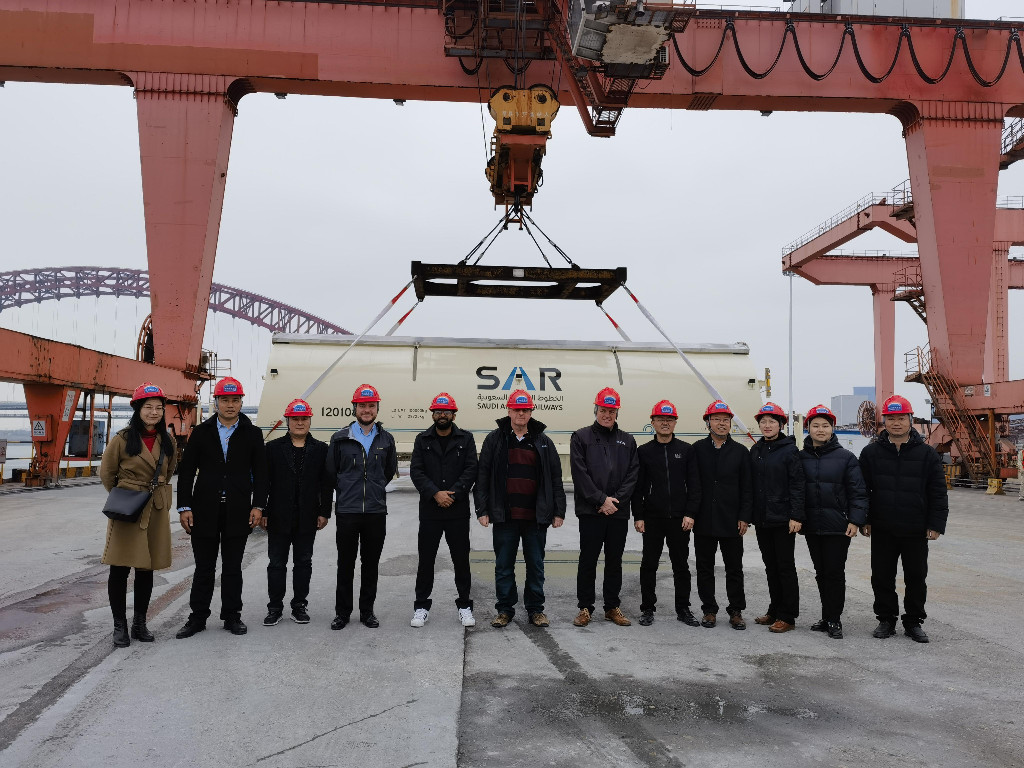 当天上午10点,一批印有阿拉伯语字样的磷酸盐漏斗车装入货轮,从株洲港起运。不同于平车和铲车,这款专为沙特客户定制的磷酸盐漏斗车具有顶盖和底门漏斗自动开闭功能,可实现全天候无人操作自动化装卸货和实时监控,可以将沙特内陆地区的矿产运输到沿海港口,大大提高运输效率。