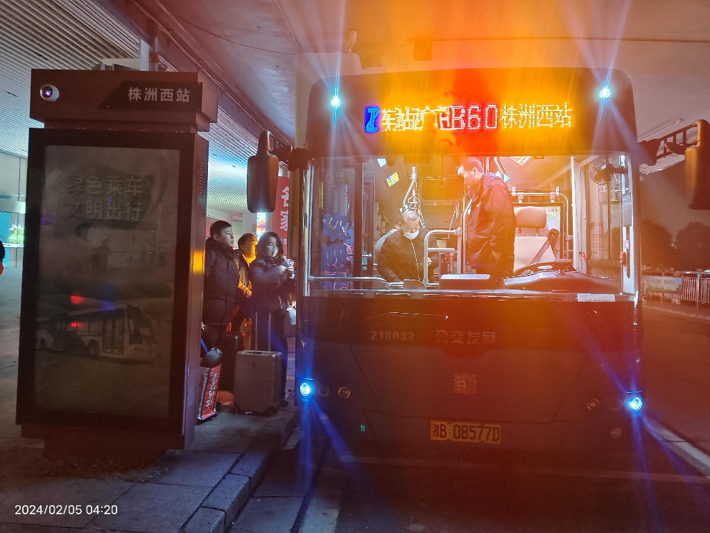 大雪无情人有情。2月4日晚 23点以后晚点高铁10余趟,最后一趟高铁晚点至凌晨5点23分。为避免到站旅客长时间滞留,株洲公交配置6台公交车运力,加密发车频率,由B60路班组长彭远江在西站通宵值班引导乘客上车,指挥车辆进出站场秩序,确保满足晚点旅客公交出行需求,为返株旅客提供平安、便捷、温馨的公交出行服务。同时,交通、铁路部门加强旅客近远端引导,远端提前告知列车晚点信息,倡导公共交通出行,近端通过车站大屏、站内广播、志愿者等多种方式加强疏导,并加大出租车、网约车保障力度,株洲西站服务中心工作人员通宵值守引导旅客乘车,交通运输执法人员现场指挥维护乘车秩序,有效保障了旅客平安回家路。