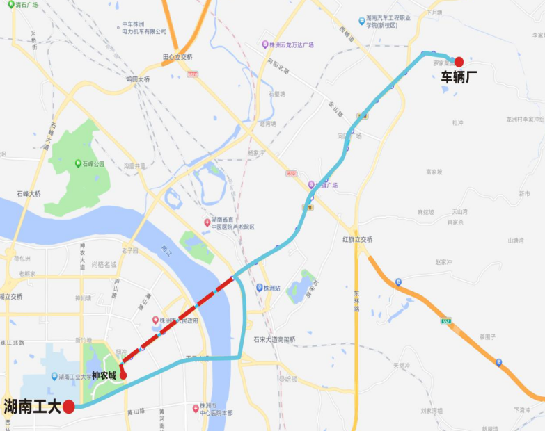 上行:湖南工大—泰山路廊道—天元大桥—建设路—中心广场—右转—新华路—红旗广场—车辆厂