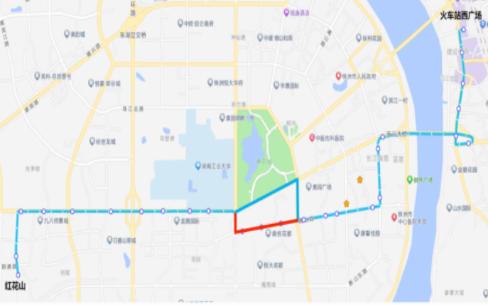减少站点:芦淞桥西—株洲大道庐山路口、和宜宾馆、长江路庐山路口、保利花园、滨江路韶山路口、市住建局