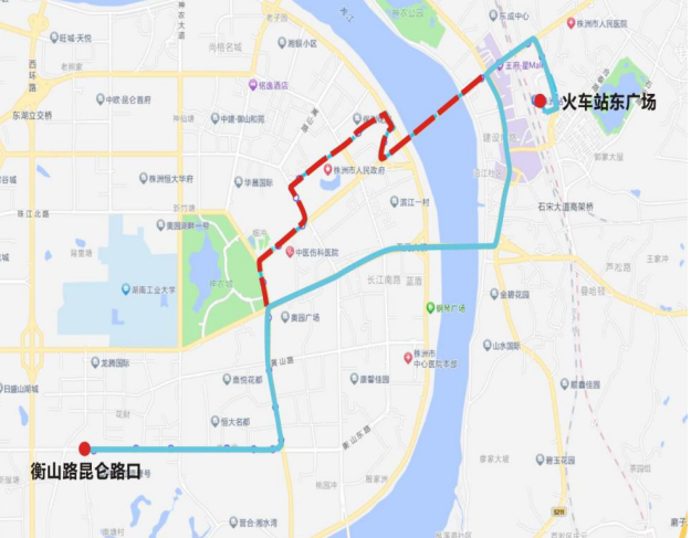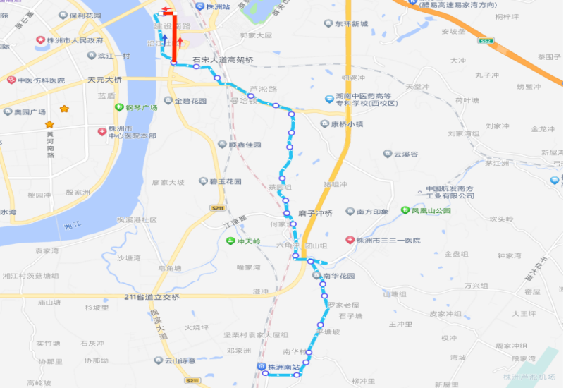 下行:城铁株洲南站—航机路—株渌路—铁东路—湘大路—芦淞路—解放街—沿江路—市妇幼保健院