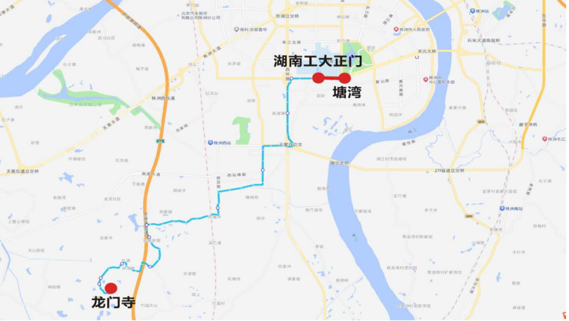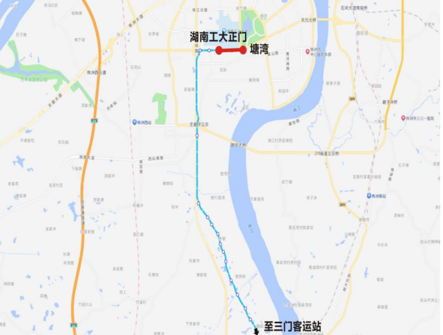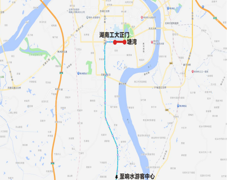 下行:湖南工大正门—泰山路西环桥下—长岭老街—株雷路滨江路口—三门镇