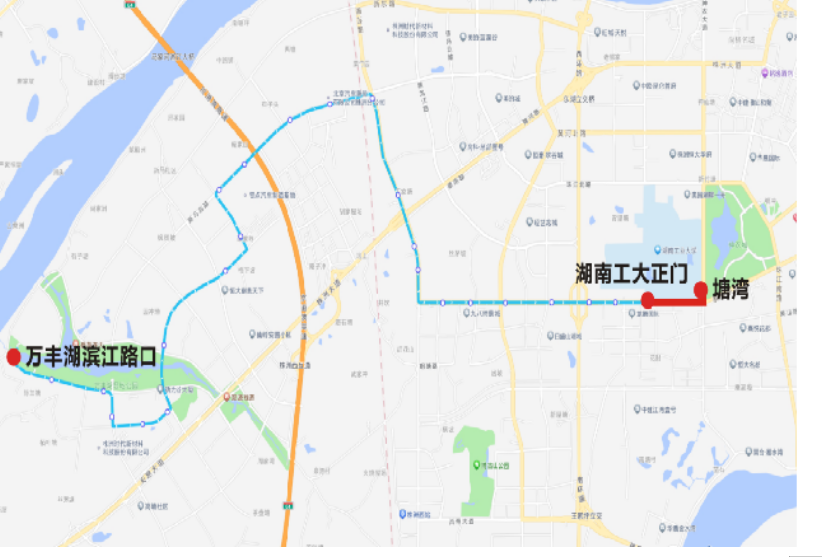 上行:湖南工大正门—渌口大桥东—城发·南洲壹号—机动车驾考中心—马家湾—许家湾—南山公园