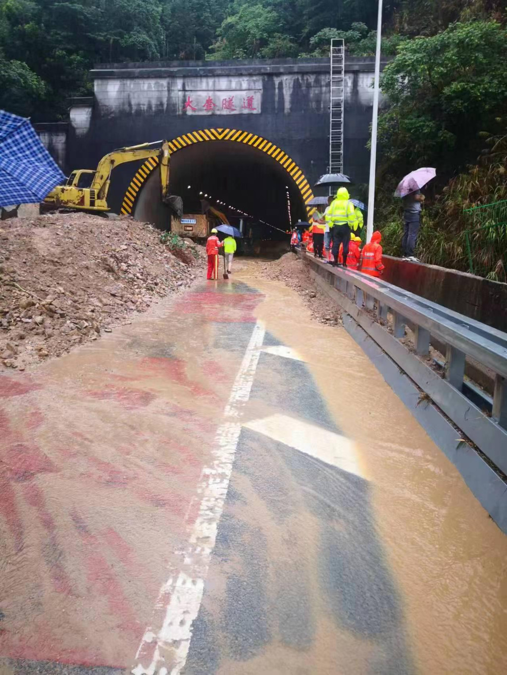 在G0422武深高速衡炎段大面山隧道,南往北方向隧道洞口因暴雨引发山洪导致泥石流冲击高速公路,大面积土石堆积物导致车辆无法通行。到达现场当即采取相关措施,与其它相关部门联合行动,投入紧急排险工作中。