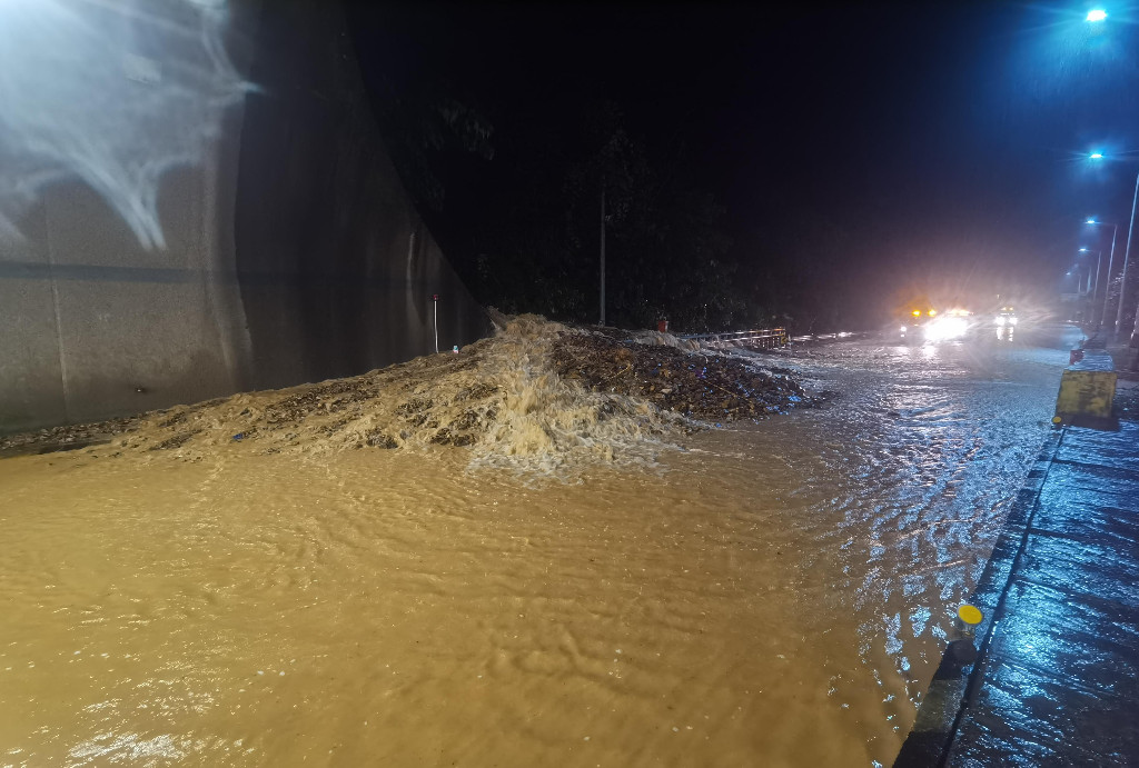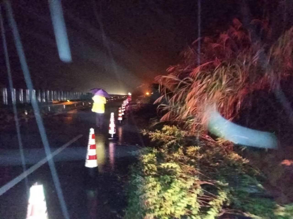 在G72泉南垄茶段茶陵东收费站附近以西K681处,由西往东方向因暴雨造成边坡滑坡,应急车道及行车道堆积着大量土方,行驶车辆只能借助超车道缓慢行驶,严重影响行车安全,现场情况十分紧急。高速公路路政执法人员会同相关单位,当即开启巡查车警报器提醒后方车辆注意减速慢行,并迅速在来车方向摆放安全标志,冒雨在事故现场进行值守。