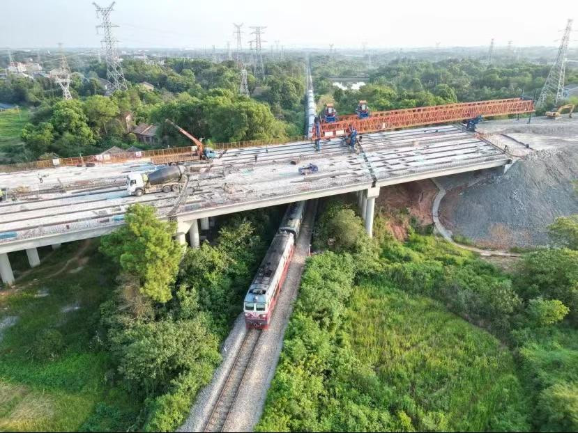 该桥全长357.2米,共设34米箱梁100片,其中10片箱梁上跨运行繁忙的醴茶铁路。为安全、快速、顺利完成涉铁施工,项目部多次与广铁集团和其所属的衡阳工务段、长沙电务段、株洲车站等相关部门沟通对接,打通难点堵点,严格按照广铁集团划定的7个Ⅲ级安全风险封锁点和每天180分钟的天窗时间组织施工。