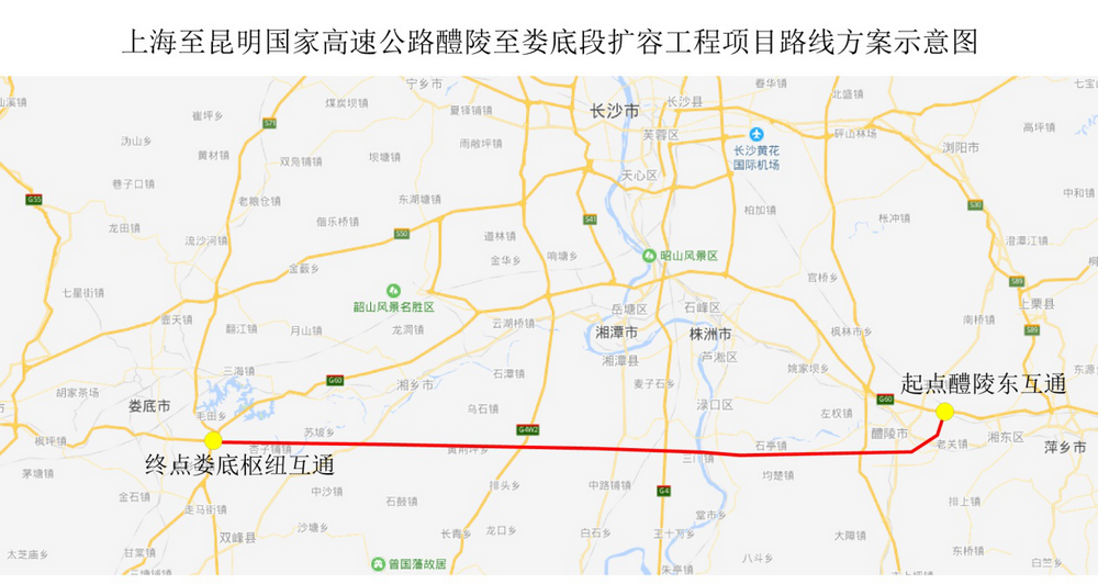 路线起自醴陵市金鱼石主线收费站以西,接已建沪昆国家高速公路醴陵至萍乡段,经东富、神福港、株洲县城南等,止于娄底市娄星区,接已建沪昆国家高速公路湘潭至邵阳段,路线全长约155公里,全线共设置18处互通式立交,其中株洲段长约61公里,设9处互通,即:醴陵东(枢纽)、东富、孙家湾、长寿桥(枢纽)、神福港、楚亭、株洲县、三门、竹霞(枢纽)。主线采用双向六车道高速公路标准另辟新线改扩建,设计速度采用120公里/小时,路基宽度按照34米控制。项目总投资预计为232.4亿元。