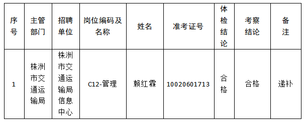 根据《2018年株洲市直事业单位公开招聘工作人员公告》通过公开报名、资格审查、笔试、资格复审、面试等程序,经人力资源和社会保障局审核,现将体检和考察合格的拟聘人员赖红霖予以公示。公示期为七个工作日( 2019年3月19日-2019年3月27日),如有异议,请在公示期内实名书面反映。不允许借机捏造事实,泄愤报复或者有意诬陷,一经查实,将严肃处理。