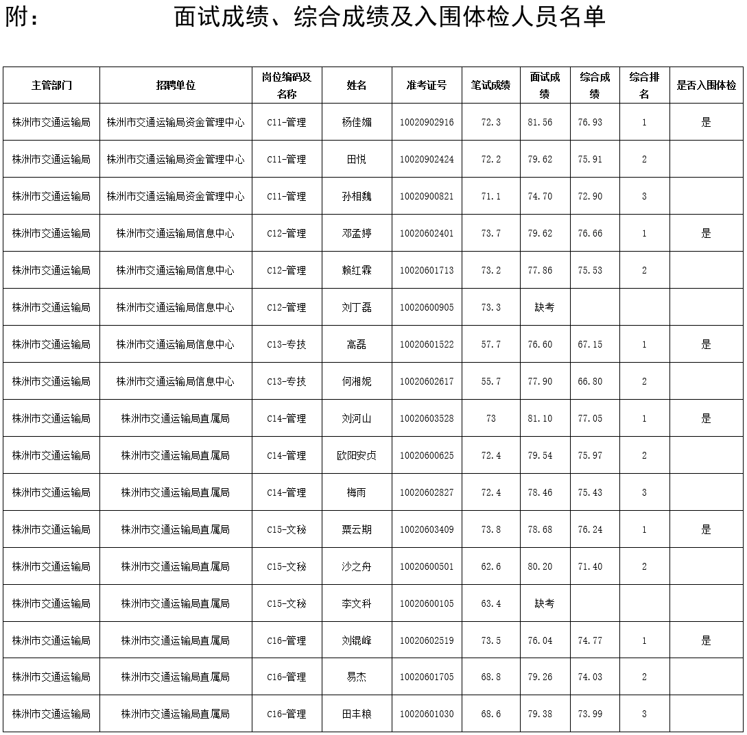 2018年株洲市交通运输局公开招聘集中面试成绩及入围体检人员名单公示