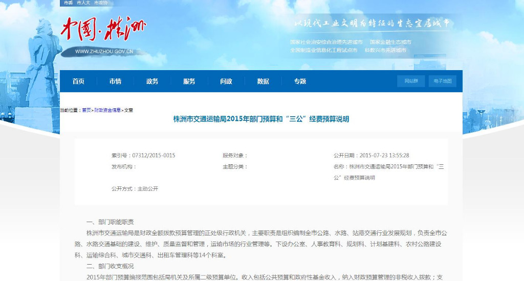 四是推进部门财政资金信息公开。按照财政部门的要求和部署,在网站公布了《株洲市交通运输局2015年部门预算和“三公”经费预算说明》和《株洲市交通运输局2014年部门决算说明》。