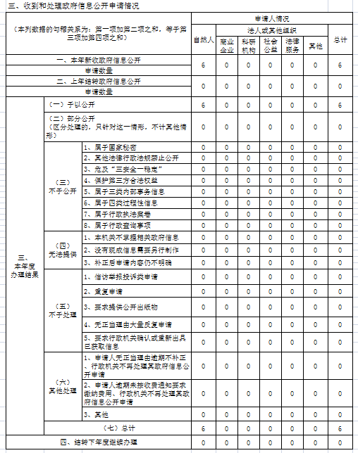 (二)依申请公开。2023年,我局共收到依申请公开6件,上年结转依申请公开0件,其中予以公开6件,其他处理0件,不予处理0件,结转下年度继续办理申请公开0件。因依申请公开引起的行政复议案件0件,行政诉讼案件0件。(三)政府信息管理。我局3月份及时调整了政务公开工作领导小组成员名单,建立了主要领导亲自抓、分管领导具体抓、工作人员负责抓,形成了一级抓一级、层层抓落实的组织领导机制;建立了网站日常检查台帐及网站安全监控等制度。